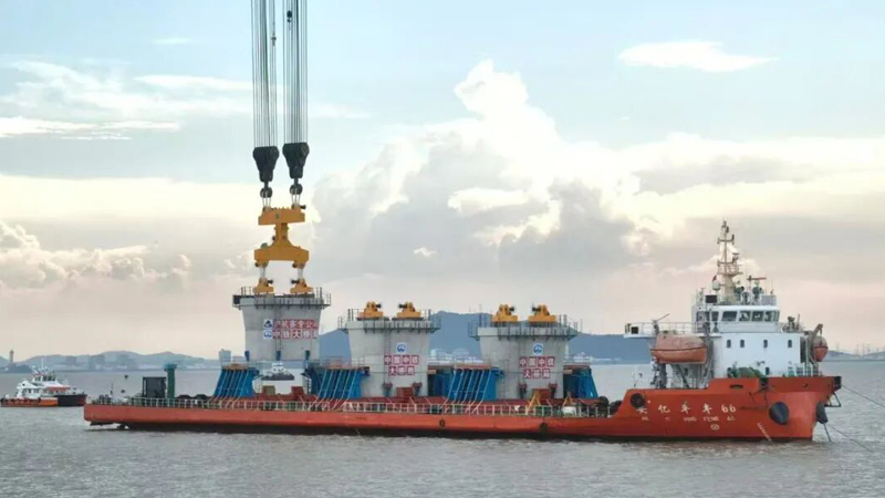 我國自主建造的最大噸位、最大儲氣量的新型海上浮式液化天然氣生產裝置NGUYA FLNG(恩古雅海上浮式液化天然氣裝置)在江蘇南通(啟東)呂四港啟航,巨力索具5000T吊梁大展風采。